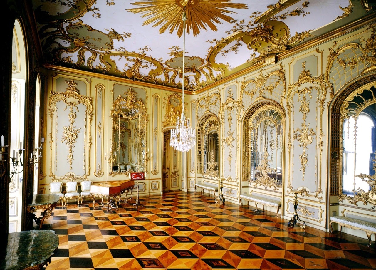 The New Palace or Neues Palais is a palace situated on the western side of the Sanssouci royal park in Potsdam, Germany. The building was begun in 1763, after the end of the Seven Years' War, under Frederick the Great and was completed in 1769. It is considered to be the last great Prussian baroque palace.While Frederician Rococo was established at Sanssouci, Frederick the Great had the New Palace built in varying forms of baroque architecture and decoration, with some deviations. The King preferred rococo and baroque to the classicism that was already taking hold of Europe at the time as the preference of many monarchs. Architect Johann Gottfried Büring, with the aid of Heinrich Ludwig Manger, was assigned with the task of planning the New Palace and had already demonstrated success with the completion of the Chinese Teahouse and the Picture Gallery in the Sanssouci royal park. After disagreements over the design of the palace, in 1764 the design of the palace was totally vested in the architect Carl von Gontard. The three-story façade had already begun to rise around unfinished interiors, as construction had steadily been underway. With 220 metre east and west façades, the centre portion of the palace was crowned with an enormous dome, at the top of which were placed the Three Graces supporting the Prussian royal crown. The dome is not only architectural, it provides an attic area under the supporting timbers which carry it. Additionally, the north and south auxiliary wings are crowned with domes surmounted by gilded eagles. Between the pilasters, what appears to be brick is actually a painted effect, leaving only the King’s south wing with exposed brick. Repointing the mortar of the joints proved to be an arduous and expensive task, therefore Frederick had the brick covered in stucco and painted in such a way that even tourists today are fooled by the deceptive finish. Over 400 sandstone statues and figures adorn the palace and auxiliary buildings, created by many notable sculptors, namely Johann Peter Benckert, Johann Matthias Gottlieb Heymüller, the brothers Johann David and Johann Lorenz Räntz and more.